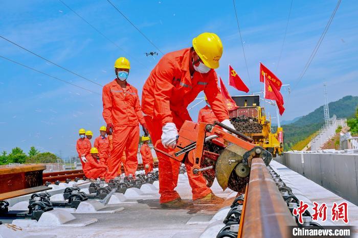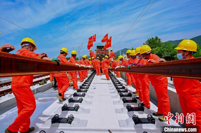 在安徽省黄山市的昌景黄高铁安徽段铁路建设施工现场,首对500米长钢轨被安全平稳地铺设到无砟轨道道床上,标志着昌景黄高铁安徽段正式进入铺轨施工阶段,力争2022年底具备开通运营条件。