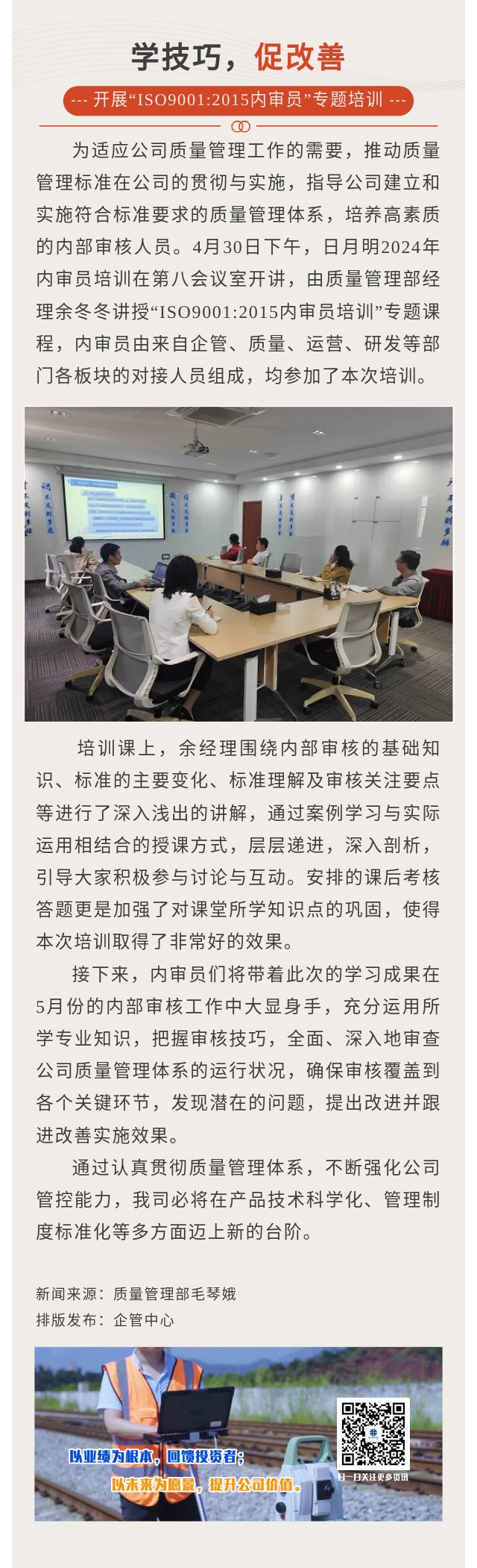 学技巧,促改善--开展“ISO9001:2015内审员”专题培训